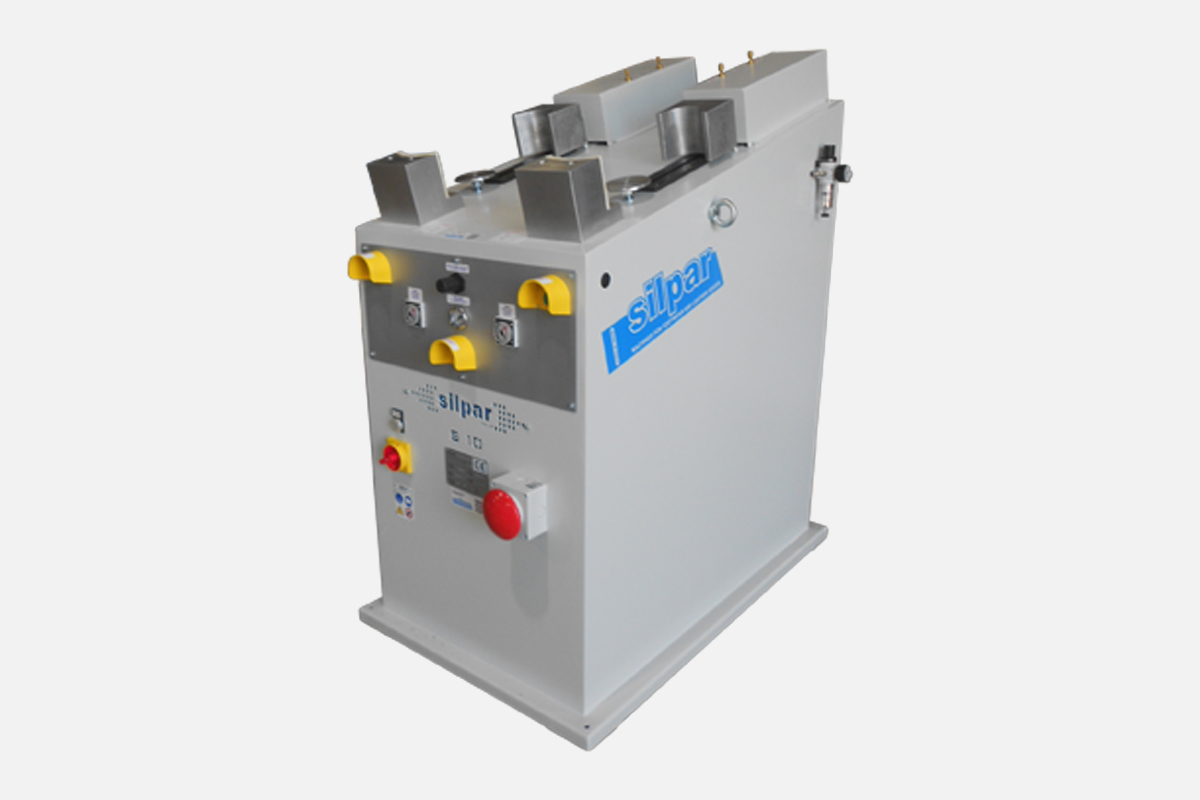 Pressa pneumatica con due cilindri indipendenti per l'applicazione di puntali in acciaio.
