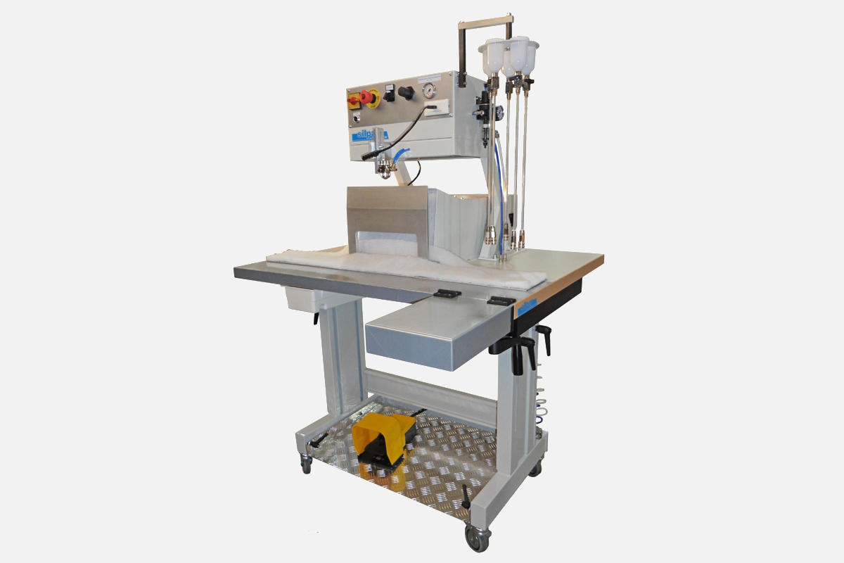 Quick couplings for replacing colour cups and height-adjustable work table.